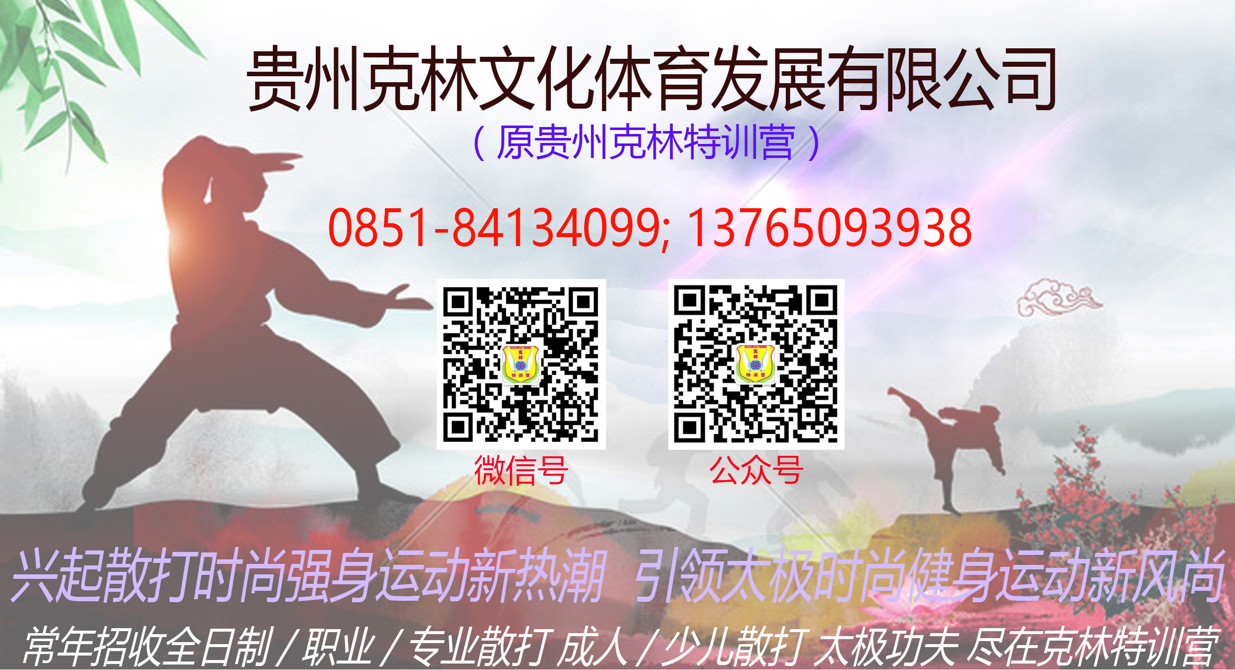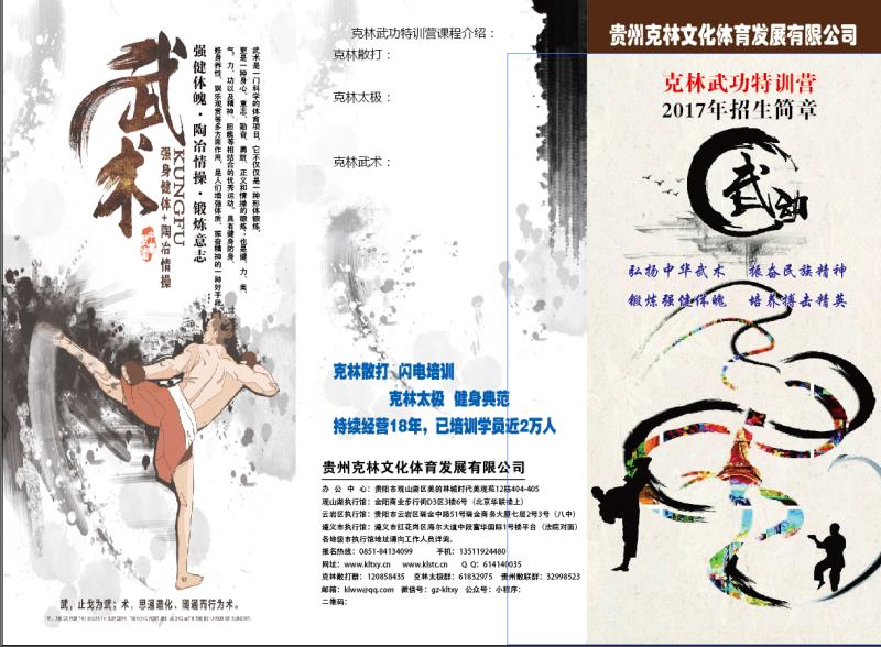 贵州克林文化体育发展有限公司 简 介 贵州克林文化体育发展有限公司,成立于2008年,是一家以教授中国传统武术为特色、以传播中国传统文化为核心的教育培训机构。公司前身贵州克林特训营自2000年起便专注于中国武术的推广和培训。公司主要经营范围:体育健身类训练、培训;户外活动、体验式拓展...[详情]